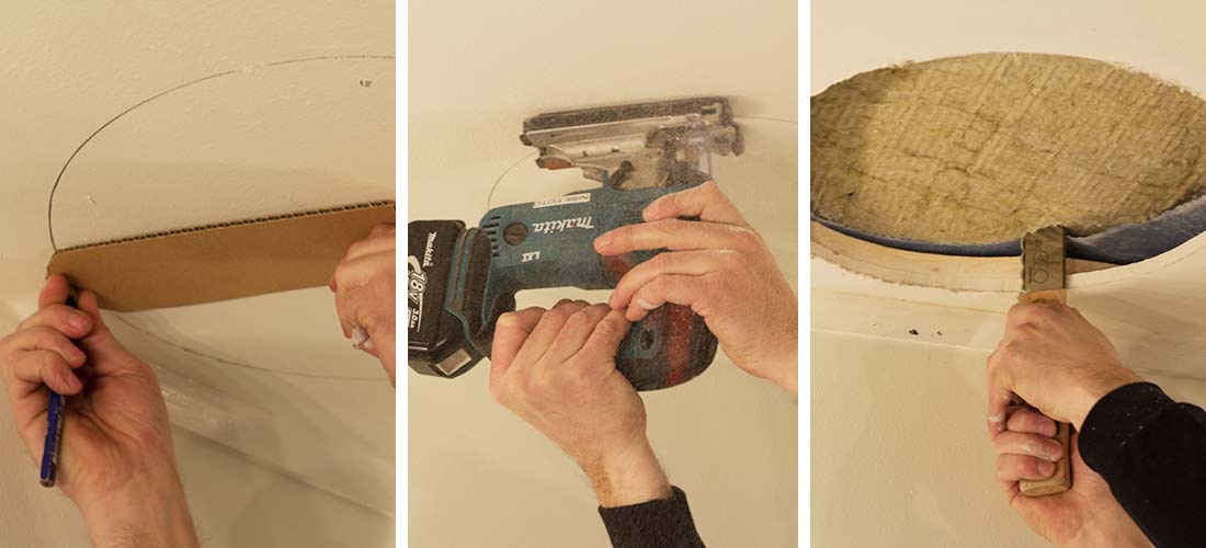 Såga upp hålen, och se till att ni sågat tillräckligt stort. Det är lättare att såga korrekt storlek på en gång, än att behöva såga igen när skorstenen är monterad genom hålen. Hellre 1cm för mycket än för lite. Men som med allt, lagom är bäst! Såga inte större än vad genomföringsplåtarna täcker.